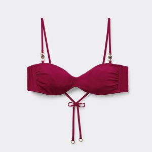 Tank style bikini top, wireless and unpadded for a natural effect. It features a minimal fit that exalts the silhouette with a touch of sensuality and refinement. The bright silk-effect fabric embellished by elegant golden details radiates a sophisticated sensation of discrete luxury. Adjustable shoulder straps and string tie fastening complete the design for this summer look that does not pass by unnoticed.