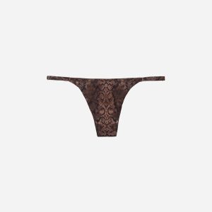 Thong bikini bottoms with adjustable thin sides. The slightly rounded front allows for wearing it either as normal or with the legs higher on the sides to show off the physique. The style features a sophisticated dark brown animal pattern embellished with small nickel-free rings. Fully lined with invisible seams.