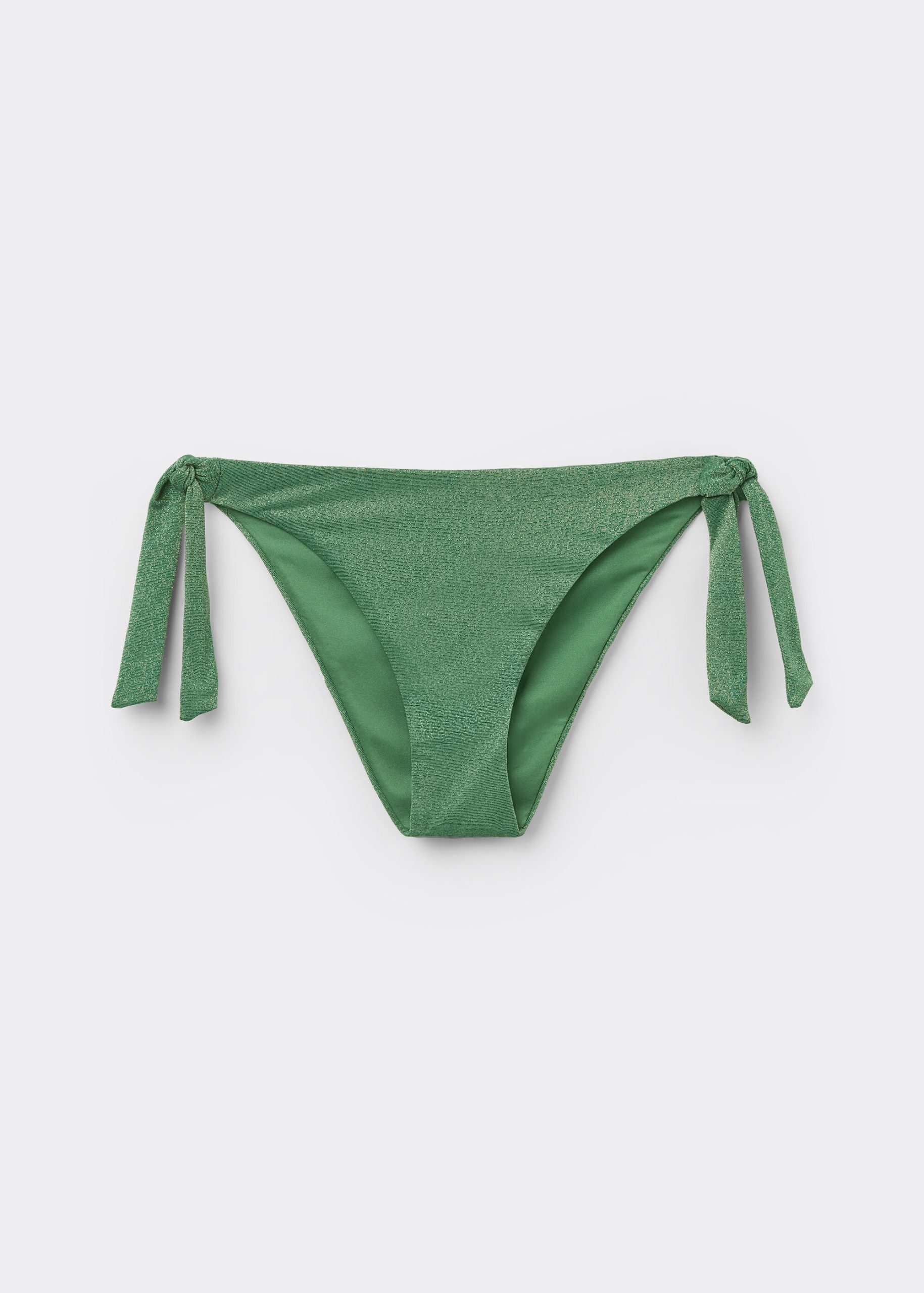 Bikini bottom with side tie closure to adjust the fit. Soft fabric with shiny lamé thread. Fully lined.