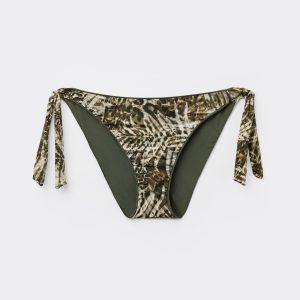 Bikini bottoms with side tie closure to adjust the fit. Reminiscent of animal print, the foliage pattern brings together exotic leaf designs with motifs that evoke markings from the animal world. The slightly rounded waist allows it to be worn either as normal or with the legs higher to show off the physique. Fully lined with invisible seams.