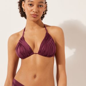 Wireless slide triangle bikini top with cups with removable padding. The style features bright fabric and ruching on the cups. The shoulder straps have eyelets on the ends so they can be hooked onto the back band or tied behind the neck. Back string tie closure.
