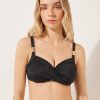 Wireless slide triangle bikini top with cups with removable padding. The style features bright fabric and ruching on the cups. The shoulder straps have eyelets on the ends so they can be hooked onto the back band or tied behind the neck. Back string tie closure.