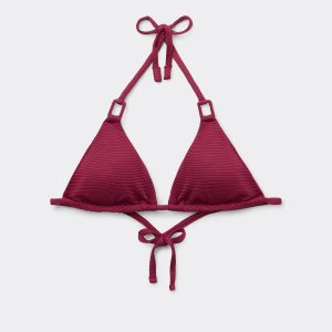 Slide triangle bikini top with removable padding, wireless for a natural effect. The elegant and hard-wearing piqué fabric with its distinctive texture is embellished by a chic accessory that further exalts the style. The shoulder straps have eyelets on the ends so they can be hooked onto the back band or tied behind the neck. Back string tie closure.