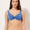 Slide triangle bikini top with removable padding, wireless for a natural effect. Made in stylish shiny lamé fabric that provides a luminous and sophisticated effect. The shoulder straps have eyelets on the ends so they can be hooked onto the back band or tied around the neck. Back string tie closure.