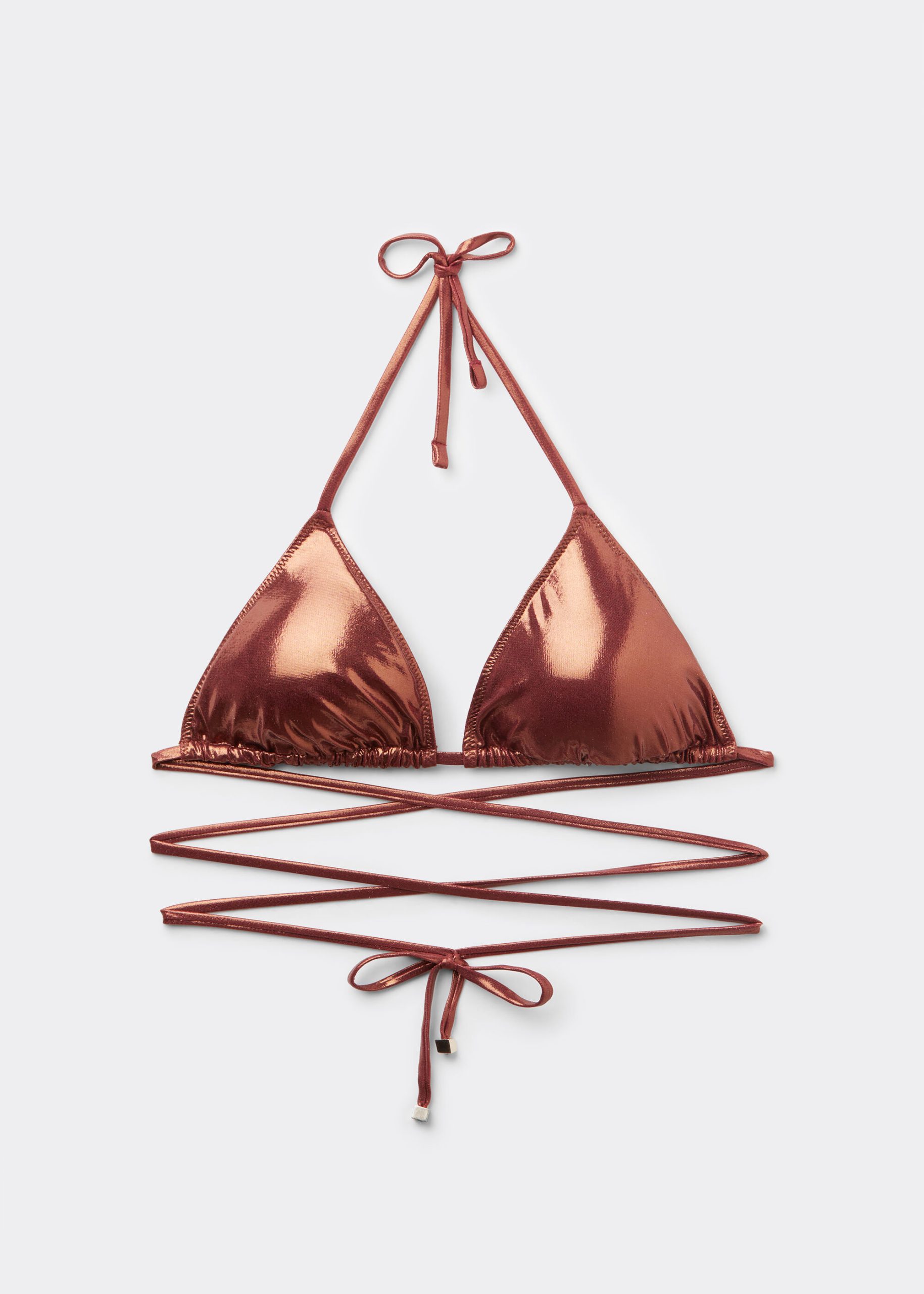 Slide triangle bikini top with removable padding, wireless for a natural effect. The style features a extra shiny, metallic effect fabric and long crisscrossed straps at the bust. The shoulder straps have eyelets on the ends so they can be hooked onto the back band or tied behind the neck. Back string tie closure.