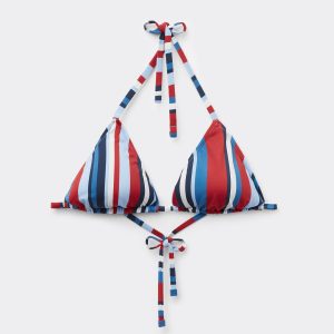 Slide triangle bikini top with removable padding, wireless for a natural effect. Made from soft microfiber, the top is embellished with a vibrant multi-colored striped pattern, which adds a touch of freshness and color to the look. The shoulder straps have eyelets on the ends so they can be hooked onto the back band or tied around the neck. Back string tie closure.
