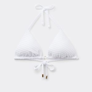 Slide triangle bikini top with removable padding and no underwire for a natural effect. The style features a particularly soft three-dimensional diagonal-motif fabric. The shoulder straps have eyelets on the ends so they can be hooked onto the back band or tied behind the neck. Back string tie closure embellished with silver tips.