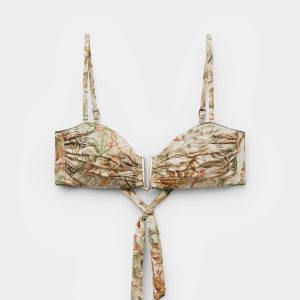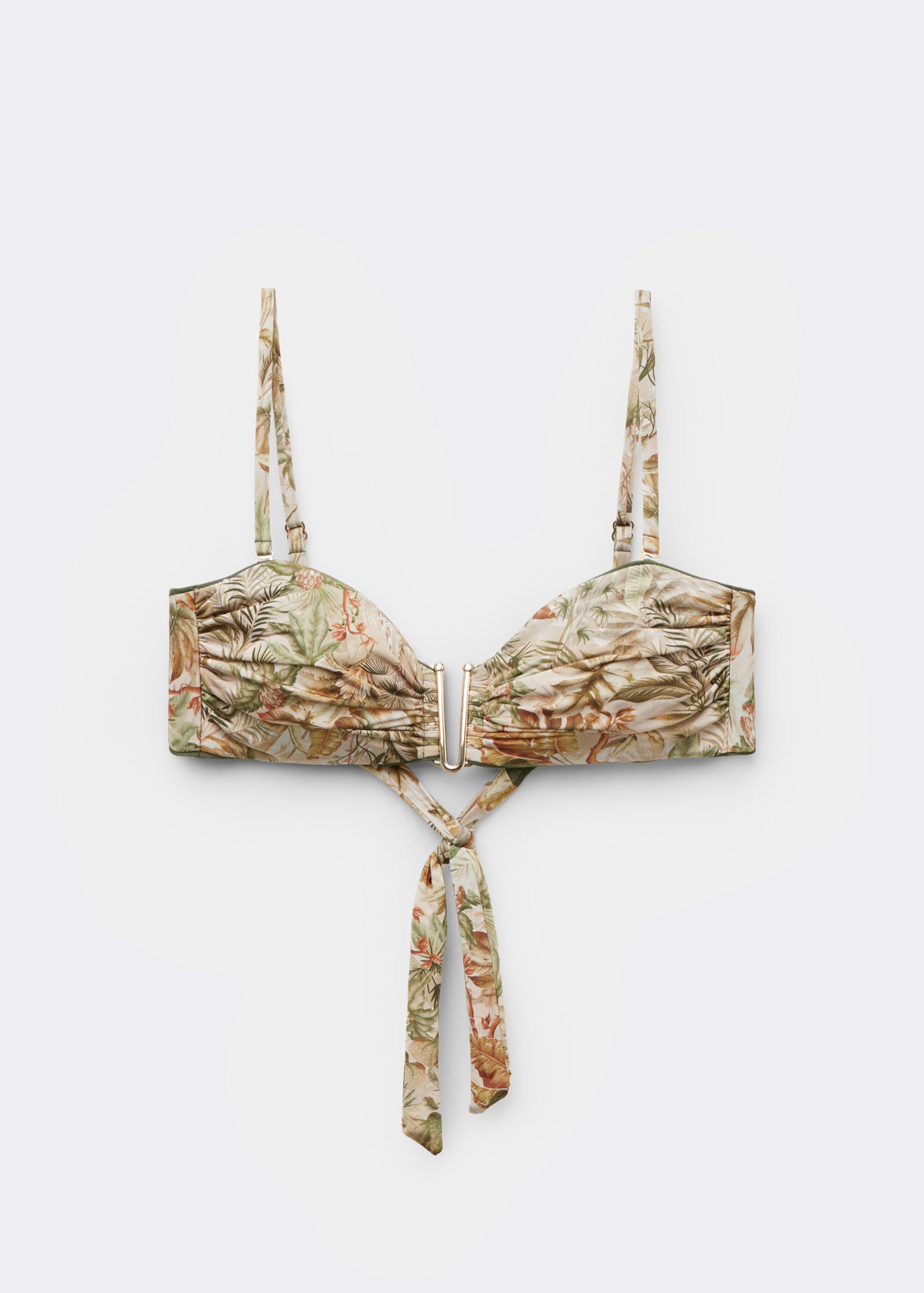 Bandeau bikini top with lightly padded cups. The side boning guarantees good support. The top is embellished with a refined foliage pattern and a gold accessory at the center of the bust. Adjustable and removable shoulder straps. Back tie closure.