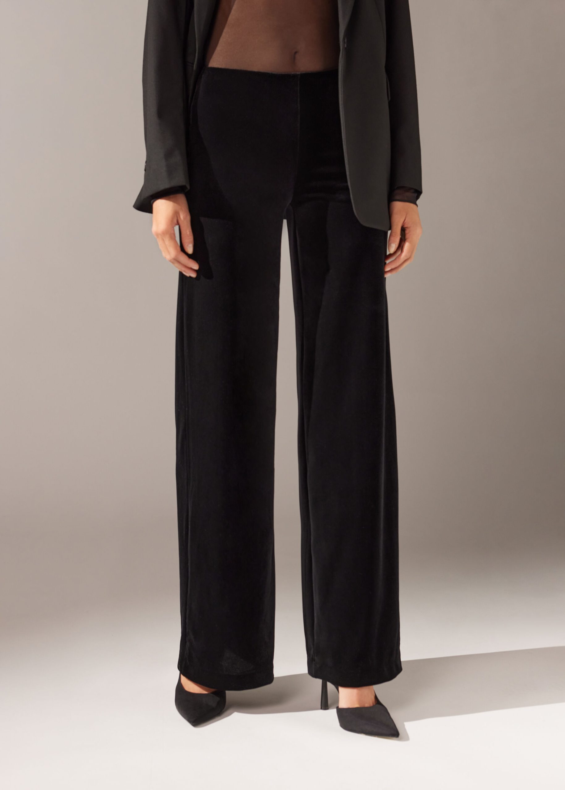 Women’s velvet palazzo pants, a perfect balance between comfort and style. This palazzo pant design features an especially soft and elegant fabric while the waistband with elastic only in the back ensures a comfortable and refined fit.